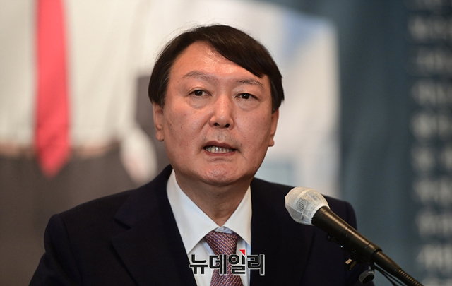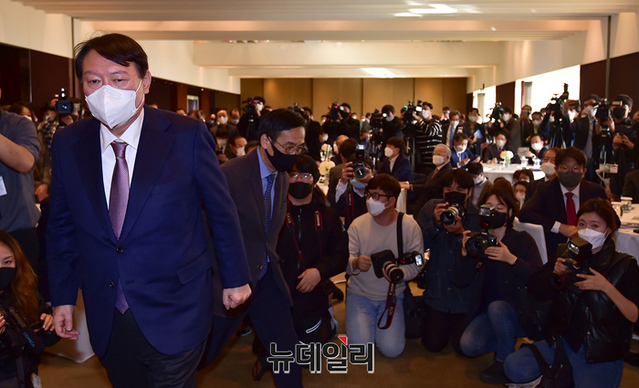 윤석열 국민의힘 대선 후보가 15일 오전 서울 용산구 그랜드하얏트 서울에서 열린 김종인 전 국민의힘 비대위원장 출판기념회에 참석해 축사를 하고 있다.