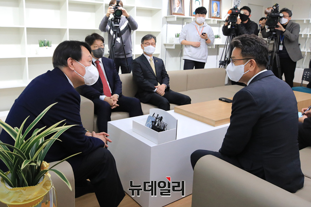 윤석열 국민의힘 대선 후보가 15일 서울 여의도 중앙당사에서 이철희 청와대 정무수석을 접견하고 있다. (사진=공동취재단)