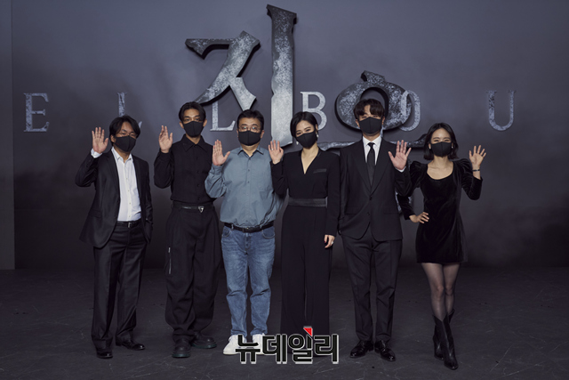 배우 양익준, 유아인, 연출 연상호, 배우 김현주, 박정민, 원진아(왼쪽부터)가 16일 오전 온라인으로 열린 넷플릭스 시리즈 '지옥' 제작발표회에서 포즈를 취하고 있다.'지옥'은 예고 없이 등장한 지옥의 사자들에게 사람들이 지옥행 선고를 받는 초자연적인 현상이 발생하고 혼란을 틈타 부흥한 종교단체 새진리회와 사건의 실체를 밝히려는 이들이 얽히면서 벌어지는 이야기를 다룬 넷플릭스 시리즈다. 19일 첫 공개. (사진=넷플릭스)