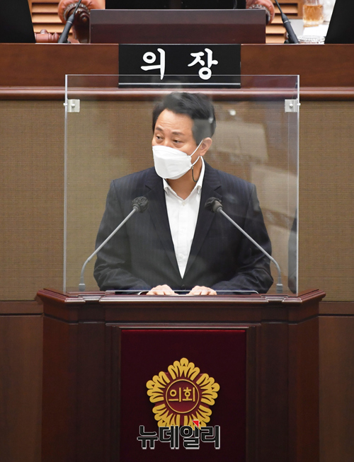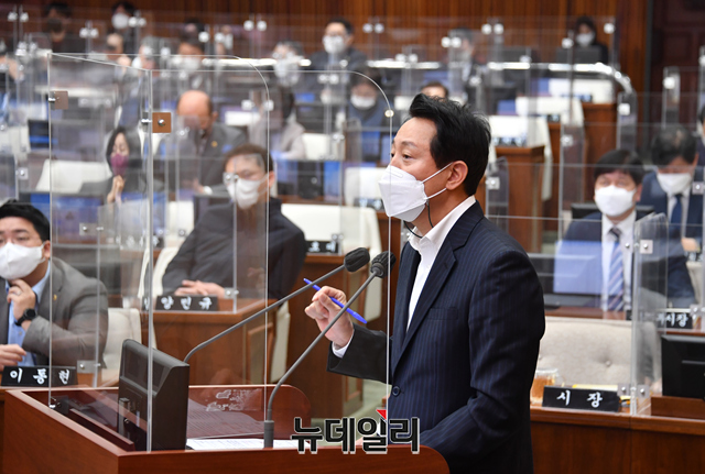 오세훈 서울시장이 16일 오전 서울 중구 서울시의회 본회의장에서 진행된 제303회 정례회에서 김헌동 서울주택도시공사(SH) 신임 사장을 소개하고 있다. (사진=서울시)