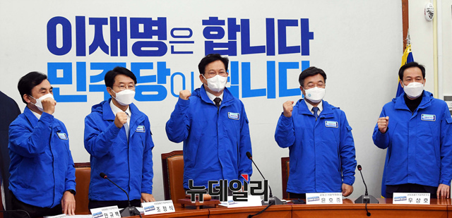 송영길 더불어민주당 상임선거대책위원장과 윤호중 공동선거대책위원장 및 본부장들이 17일 국회에서 열린 선대위 총괄본부장단 회의에 앞서 대선 승리를 다짐하는 구호를 외치고 있다. (사진=공동취재단)