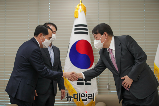 윤석열 국민의힘 대선 후보가 17일 오전 서울 여의도 국민의힘 당사에서 최원일 전 천안함 함장과 고 이상희 하사의 부친인 이성우 유족회장을 면담하고 있다.