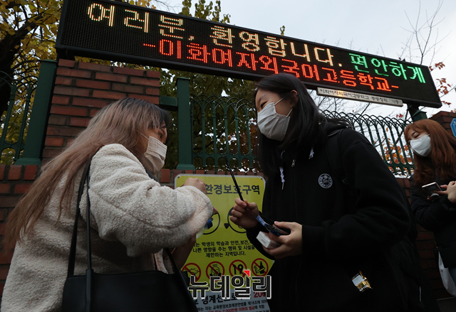 2022학년도 대학수학능력시험(수능)일인 18일 오전 서울 중구 이화여자외국어고등학교 제 15시험지구 제 20시험장 입구에서 학부모들이 고사장으로 향하는 수험생들을 바라보고 있다.