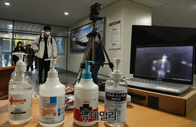 2022학년도 대학수학능력시험(수능)일인 18일 오전 서울 용산구 용산고등학교에서 수험생들이 손 소독과 체온측정 등을 거친 뒤 시험장에 입실하고 있다.