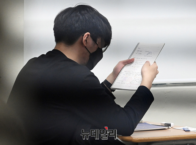 2022학년도 대학수학능력시험일인 18일 오전 서울 용산구 용산고등학교에서 수험생들이 1교시 국어영역 시험을 준비하고 있다.