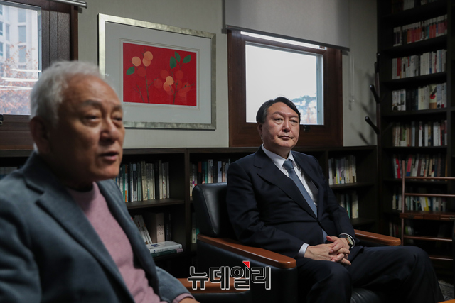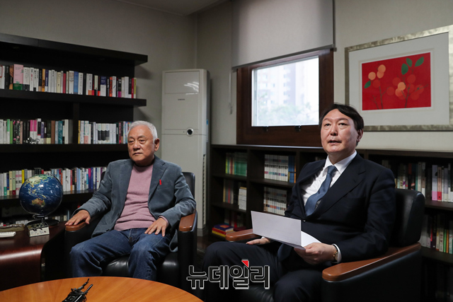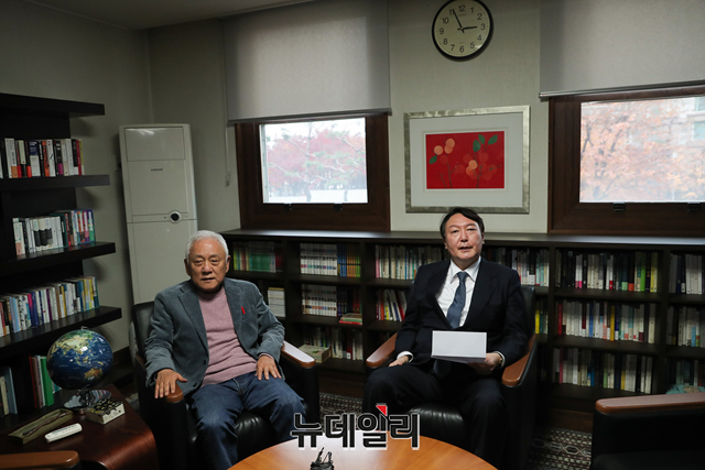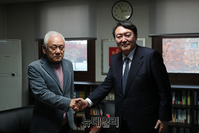 윤석열 국민의힘 대선 후보가 21일 오후 서울 용산구 김한길 전 민주당 대표 사무실을 방문해 김 전 대표와 악수를 나누고 있다. (사진=윤석열 캠프)