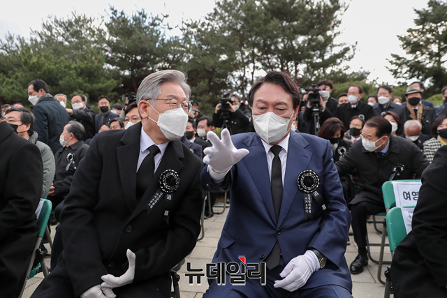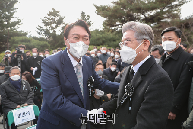 이재명 더불어민주당 대선 후보와 윤석열 국민의힘 대선 후보가 22일 오후 서울 동작구 국립서울현충원에서 열린 故 김영삼 전 대통령 서거 6주기 추모식에서 악수를 나누고 있다. (사진=윤석열 캠프)
