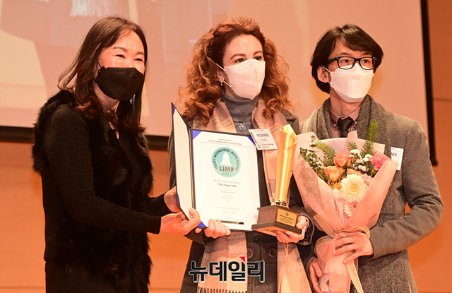 방송인 크리스티나, 성악가 김현준 부부가 22일 오후 서울 종로구 한국교회100주년기념관에서 열린 제1회 리버티국제영화제 시상식에서 최우수단편영화상을 대리 수상하고 있다. 최우수단편영화상은 이탈리아 미셀 지안그란데의 '하이터주'가 차지했다.