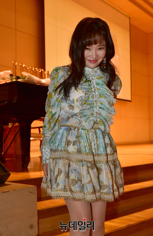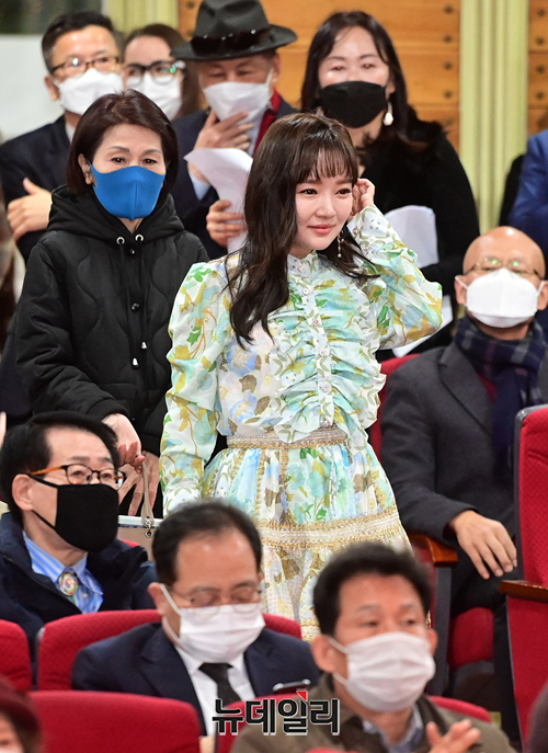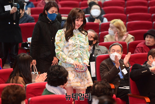 배우 윤송아가 22일 오후 서울 종로구 한국교회100주년기념관에서 열린 제1회 리버티국제영화제 시상식에서 최우수 프로덕션 디자인상 대리 수상을 마치고 무대를 내려오고 있다.