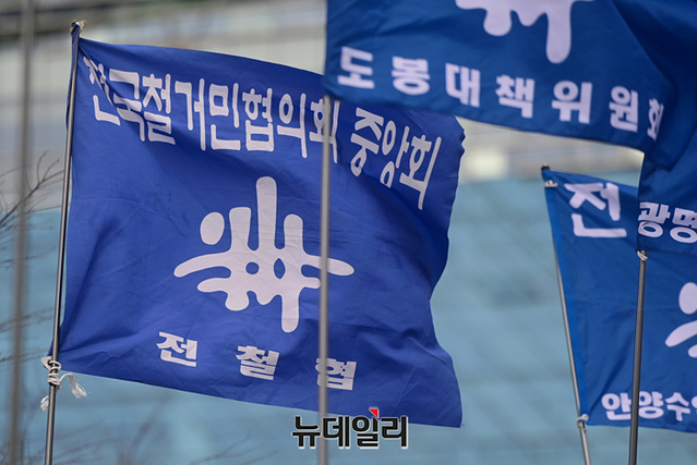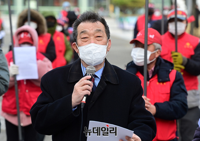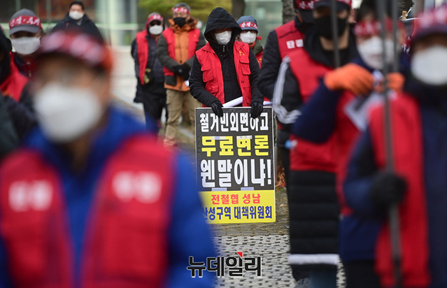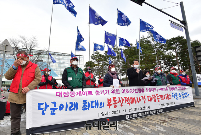 전국철거민협의회 중앙회가 23일 오전 경기 성남시청 앞에서 대장동 게이트와 관련해 검찰의 미온적인 수사를 규탄하고, 특검을 촉구하는 기자회견을 갖고 있다.