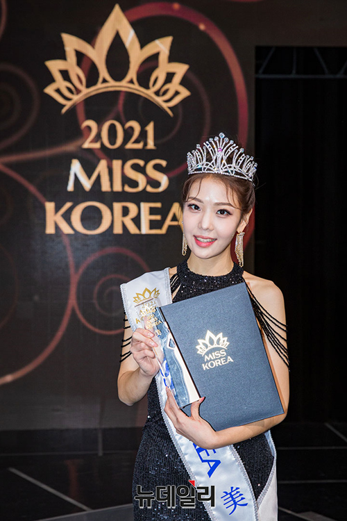 2021 미스코리아 미(美)를 수상한 조민지 씨가 16일 밤 경기 파주시 화유당 스튜디오에서 사전 녹화로 진행된 '제65회 2021 미스코리아 선발대회' 본선에서 포즈를 취하고 있다.