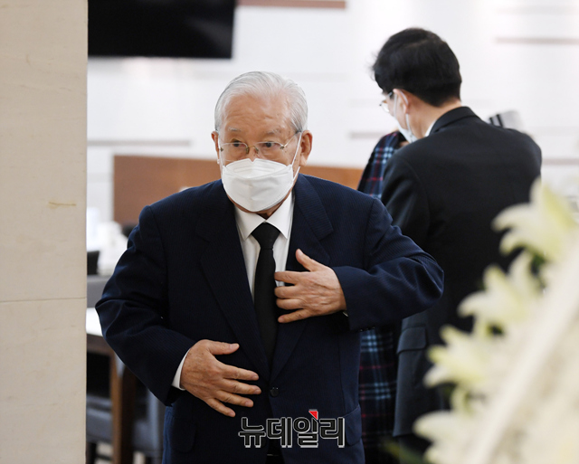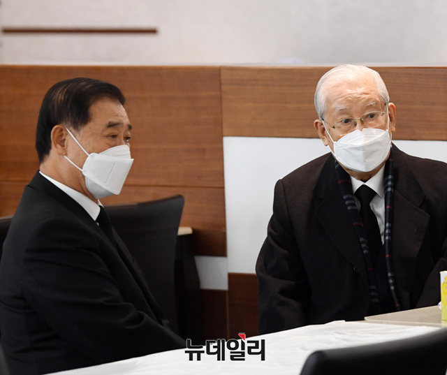 강창희 전 국회의장(왼쪽)과 장세동 전 안기부장이 24일 오전 서울 서대문구 신촌세브란스병원 장례식장에 마련된 故 전두환 전 대통령의 빈소를 찾아 조문을 마치고 대화를 나누고 있다. (사진=공동취재단)