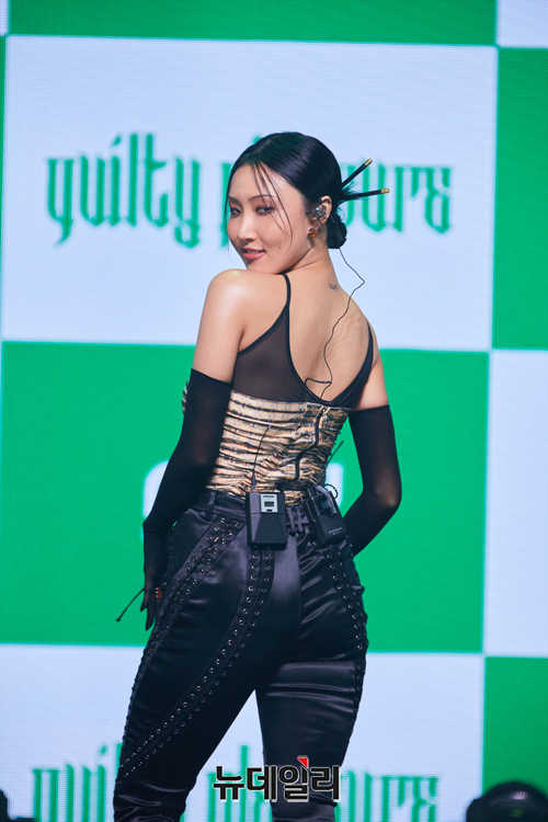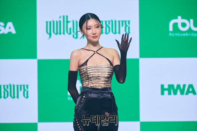 걸그룹 마마무 화사가 24일 오후 서울 광진구 예스24라이브홀에서 열린 두 번째 싱글 앨범 '길티 플레저(Guilty Pleasure)' 발매 기념 쇼케이스에서 포즈를 취하고 있다.