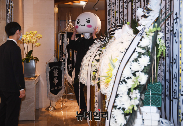 [포토] 베충이 탈 쓰고 빈소 찾은 조문객