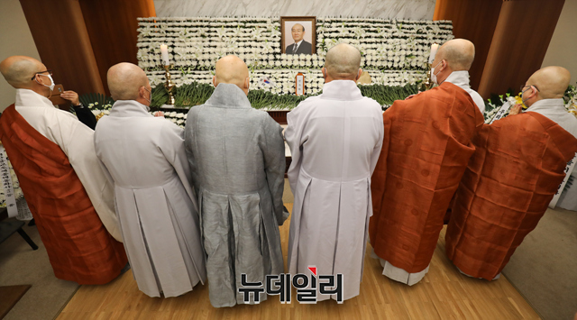 백담사 주지를 지낸 도후 스님과 일행들이 24일 오후 서울 서대문구 신촌세브란스병원 장례식장에 마련된 故 전두환 전 대통령의 빈소를 찾아 조문을 하고 있다. (사진=공동취재단)