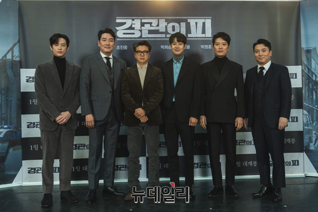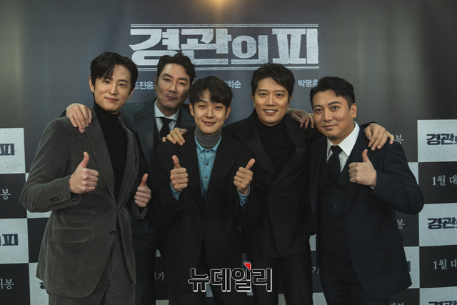 배우 권율, 조진웅, 감독 이규만, 배우 최우식, 박희순, 박명훈(왼쪽부터)이 25일 오전 온라인으로 진행된 영화 '경관의 피' 제작보고회에서 포즈를 취하고 있다.
