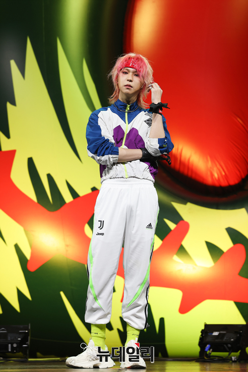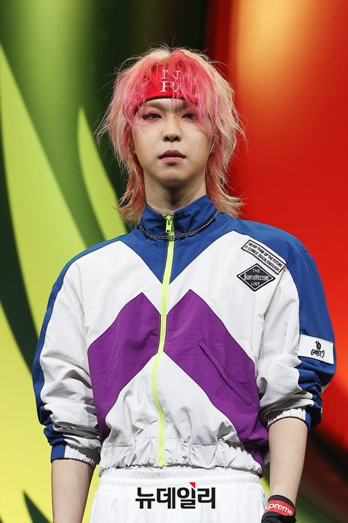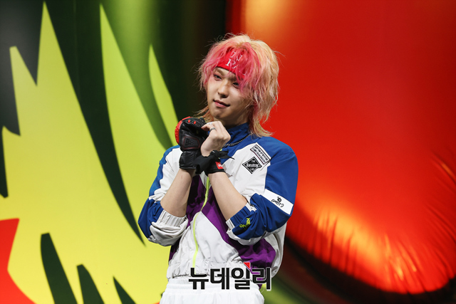 아이돌그룹 고스트나인 멤버 이신이 25일 오후 서울 광진구 예스24 라이브홀에서 열린 새 미니앨범 '나우 : 후 위 아 페이싱(NOW : Who we are facing)' 발매 기념 쇼케이스에서 포즈를 취하고 있다.