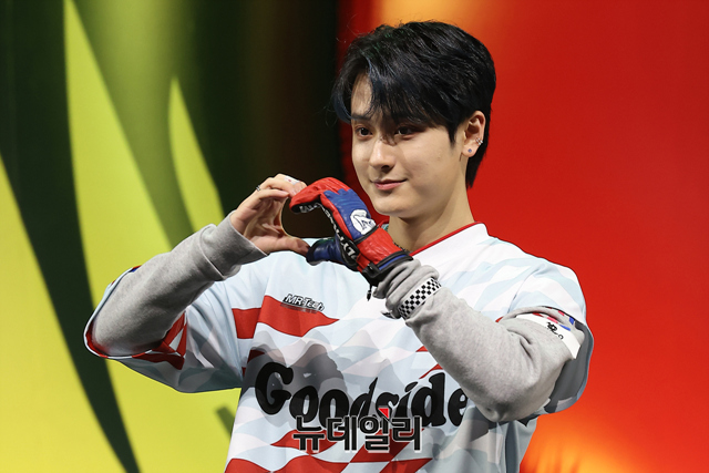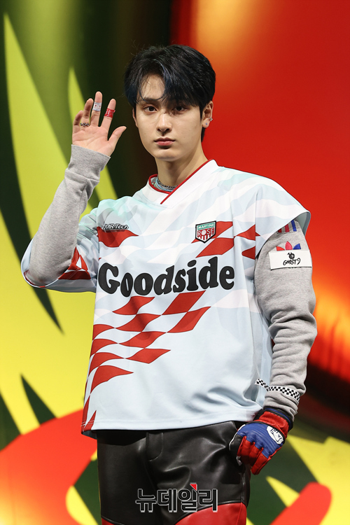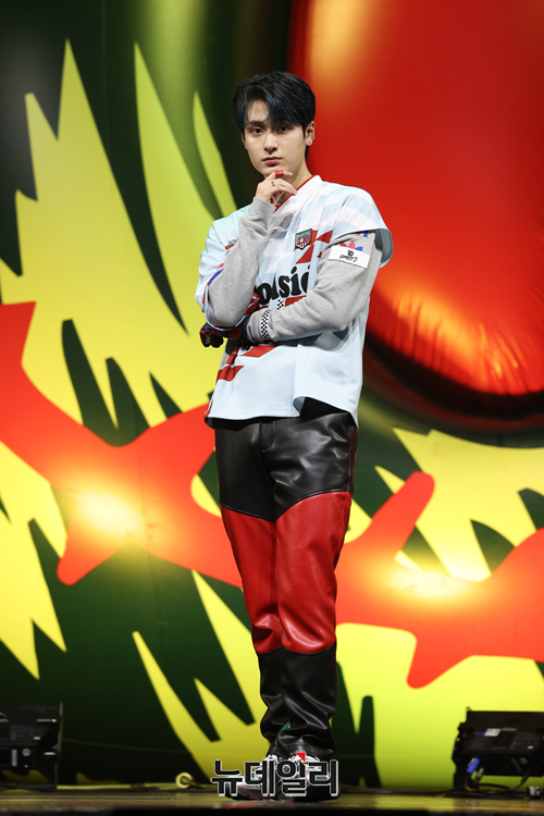 아이돌그룹 고스트나인 멤버 이우진이 25일 오후 서울 광진구 예스24 라이브홀에서 열린 새 미니앨범 '나우 : 후 위 아 페이싱(NOW : Who we are facing)' 발매 기념 쇼케이스에서 포즈를 취하고 있다.