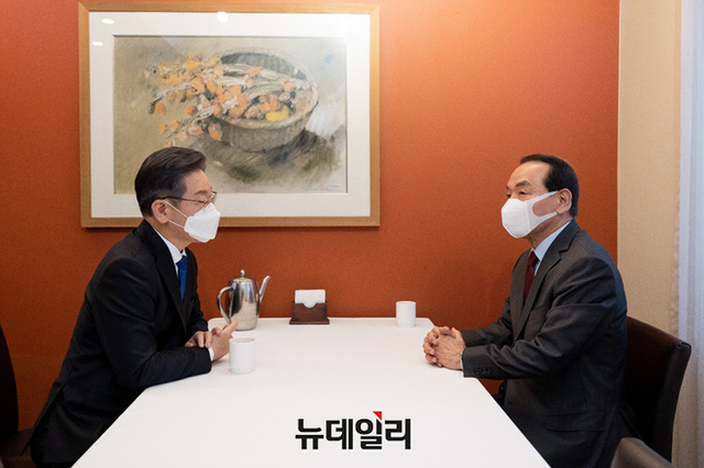 이재명 더불어민주당 대선 후보가 25일 오후 서울 광화문 모처에서 박창달 전 의원과 차담회를 갖고 있다.
