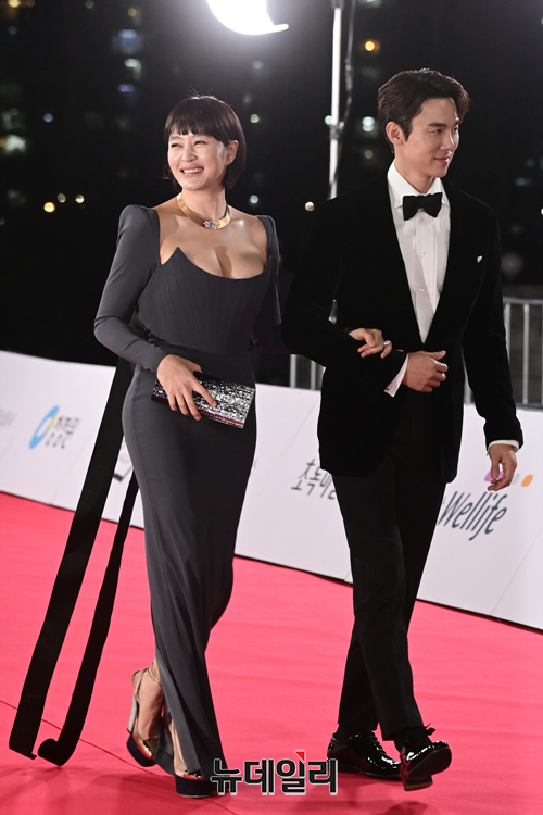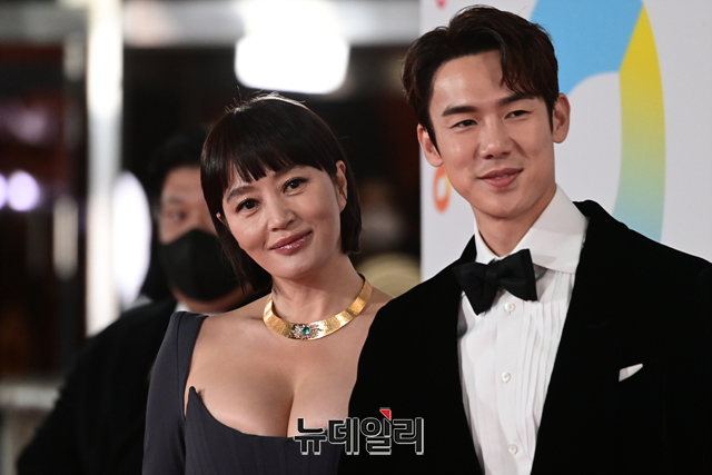 배우 김혜수, 유연석이 26일 오후 서울 여의도 KBS홀에서 열린 제42회 청룡영화상 레드카펫 행사에서 포즈를 취하고 있다.