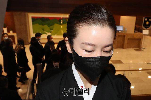 고(故) 전두환 전 대통령의 차남 전재용 씨의 부인 박상아 씨가 27일 오전 서울 서대문구 신촌세브란스병원 장례식장에서 열린 전 전 대통령의 발인식에서 영정 뒤를 따르고 있다.