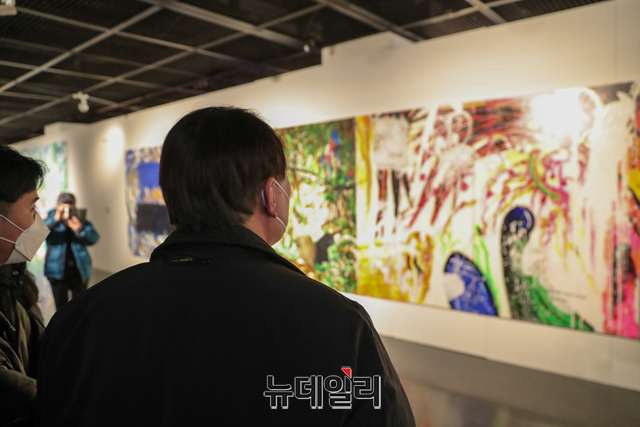 윤석열 국민의힘 대선 후보가 27일 오후 서울 서초구 예술의전당에서 열린 마스커레이드 전시에서 작품을 관람하고 있다. (사진=윤석열 캠프)