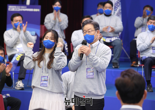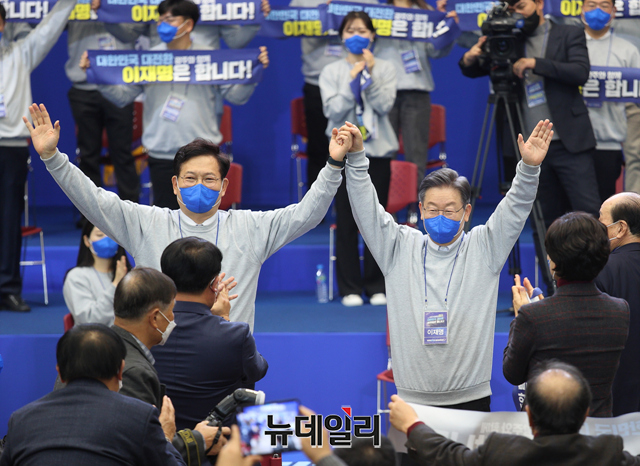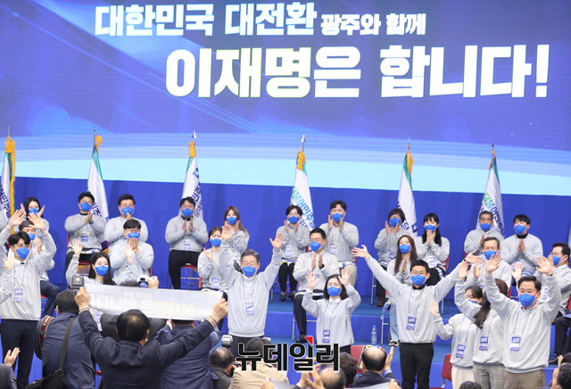 이재명 더불어민주당 대선 후보와 송영길 대표가 28일 오후 광주 서구 김대중컨벤션센터에서 진행된 광주 대전환 선대위 출범식에서 기념촬영을 하고 있다. (사진=이재명 캠프)