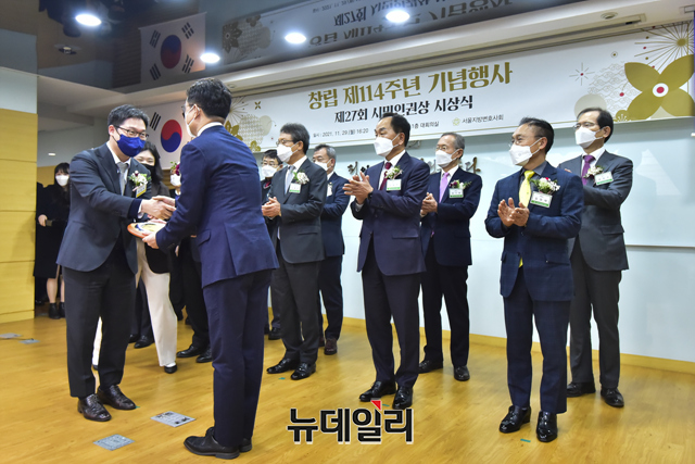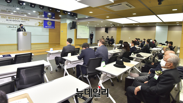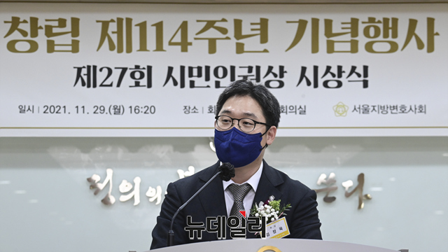 김정욱 서울지방변호사회 회장이 29일 오후 서울 서초구 변호사회관에서 열린 '서울변호사회 창립114주년 행사 및 제27회 시민인권상'에서 개회사를 하고 있다.