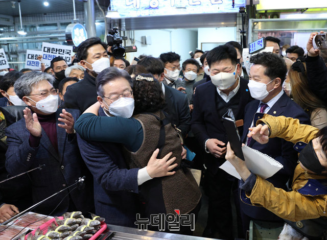 이재명 더불어민주당 대선 후보가 29일 오후 전남 영광군 영광터미널 시장을 방문해 상인과 포옹을 나누고 있다. (사진=이재명 캠프)