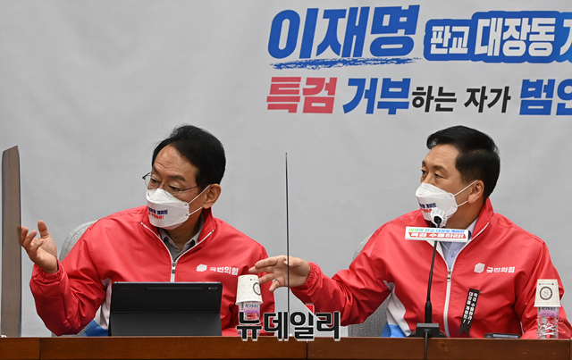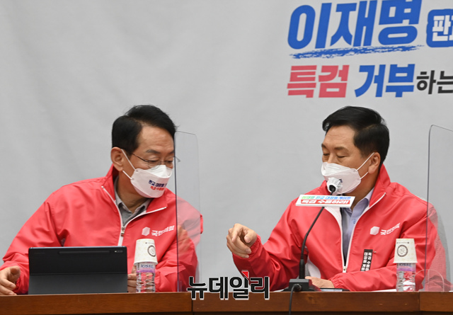 김기현 국민의힘 원내대표가 30일 오전 국회에서 열린 원내대책회의에서 참석해 김도읍 정책위의장과 대화를 나누고 있다. (사진=공동취재단)