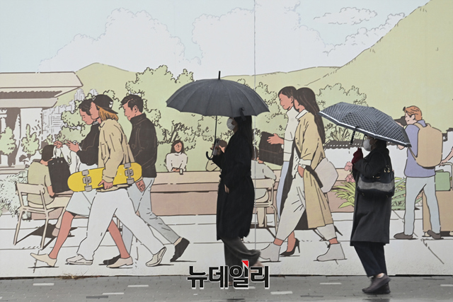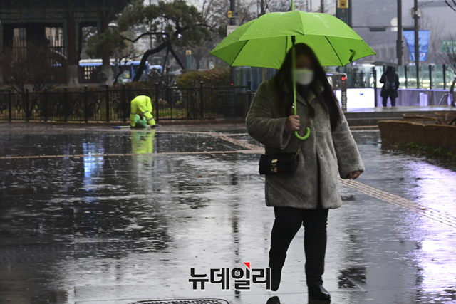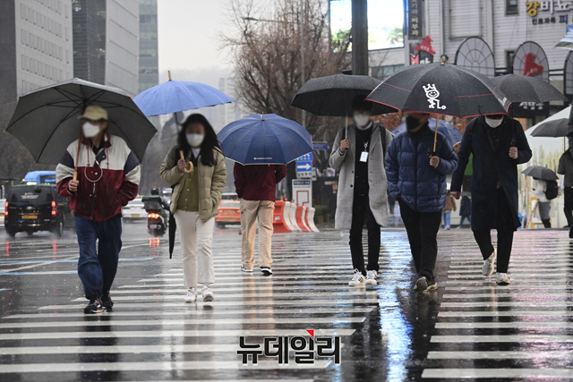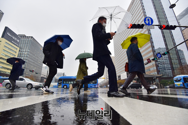 11월 마지막 날인 30일 오전 서울 종로구 세종대로사거리에서 우산을 쓴 시민들이 비가오는 거리를 이동하고 있다.