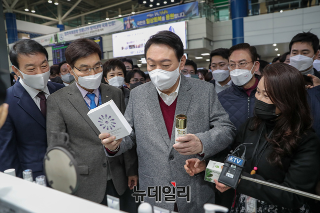 윤석열 국민의힘 대선 후보가 30일 오전 충북 청주시 청주국제공항을 방문해 공항 내 상점을 둘러보고 있다. (사진=윤석열 캠프)