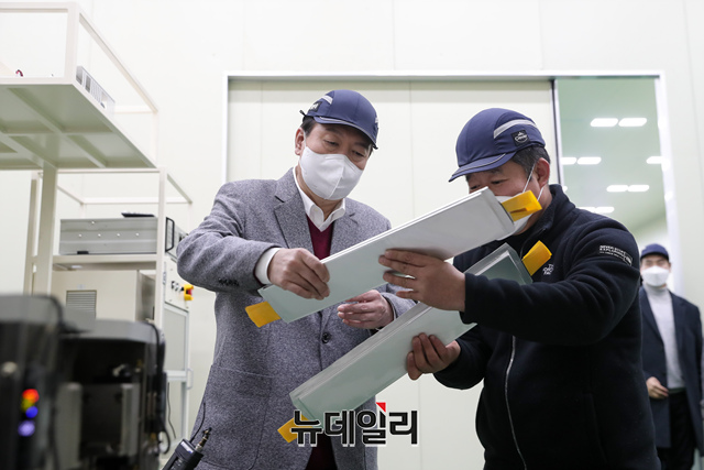 윤석열 국민의힘 대선 후보가 30일 충북 청주 청원구에 위치한 2차전지 우수 강소기업 클레버를 방문해 정종홍 대표로부터 2차전지 관련 설명을 듣고 있다.