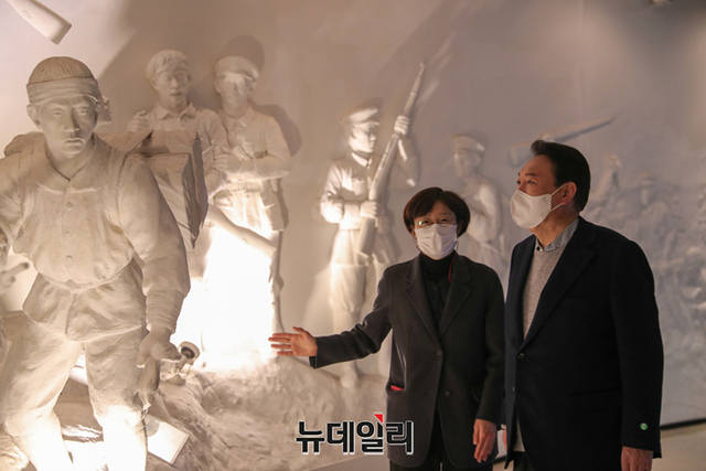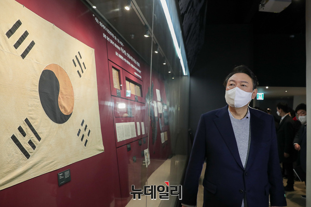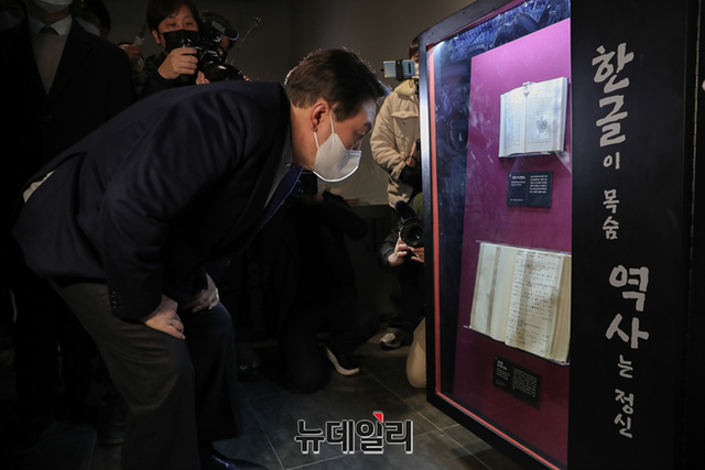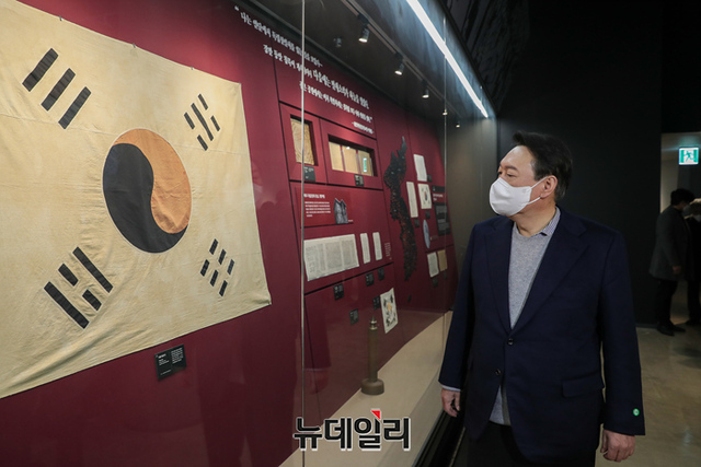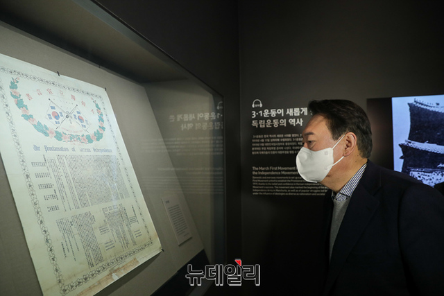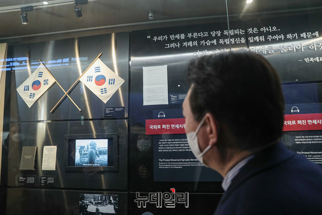 충청지역을 방문중인 윤석열 국민의힘 대선후보가 1일 오전 충남 천안시 독립기념관을 방문해 전시물을 살펴보고 있다. (사진=윤석열 캠프)