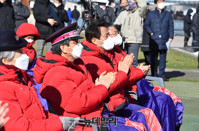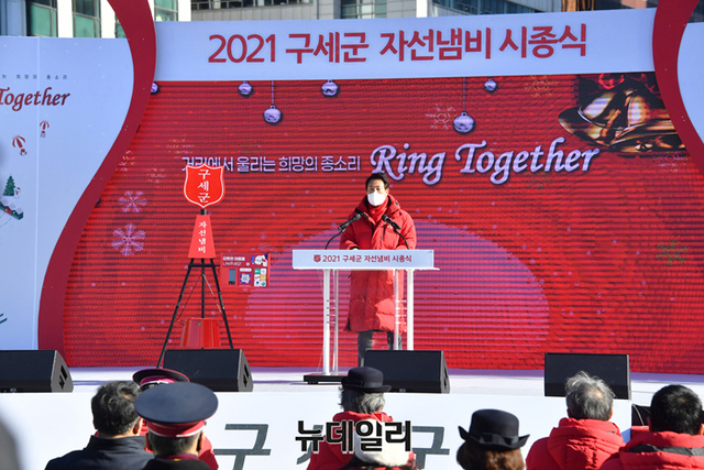 오세훈 서울시장이 1일 오전 서울광장에서 열린 2021 구세군 자선냄비 시종식에서 축사를 하고 있다. 구세군 자선냄비는 12월 말까지 전국 17개 시‧도 322곳에 설치된다. 올해 목표 금액은 총 132억 원으로 모금된 성금은 긴급지원이 필요한 취약계층을 지원하는데 사용된다. (사진=서울시)