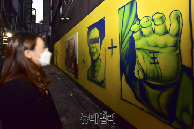 윤석열 국민의힘 대선 후보를 둘러싼 각종 논란을 담은 벽화가 다시 그려진 1일 오후 서울 종로구의 한 중고서점을 찾은 시민이 작품을 관람하고 있다.