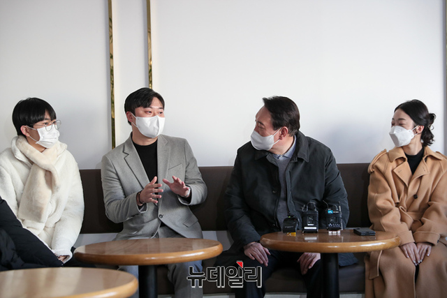 충청지역을 방문중인 윤석열 국민의힘 대선후보가 1일 오후 천안시 동남구 신부동거리를 방문해 청년들과 간담회를 갖고 있다. (사진=윤석열 캠프)