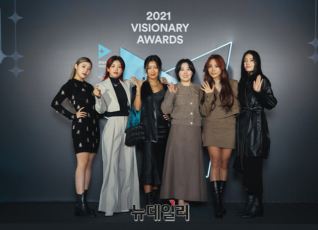 최정남 PD와 스트릿 우먼 파이터 리더들이 1일 오후 서울 마포구 CJ ENM 사옥에서 비공개로 열린 '2021 비저너리(2021 Visionary) 어워즈'에서 포즈를 취하고 있다.'2021 비저너리'는 방송, 영화, 음악, 공연 등 그 해 엔터테인먼트 업계를 관통하는 트렌드 키워드를 선정하고, 문화산업의 넥스트 비전을 제시한 인물의 업적을 조명하는 시상식이다.올해 비저너리는 △방탄소년단(BTS) △에스파(aespa) △방송인 유재석 △배우 윤여정 △최정남 PD △황동혁 영화감독 등 6인이 선정됐다. BTS와 황동혁 감독은 해외 일정으로 인해 행사에 불참 했다. (사진=CJ ENM)