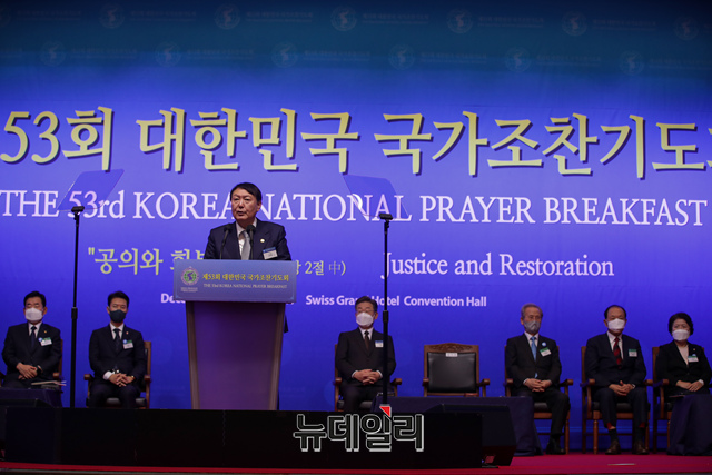 윤석열 국민의힘 대선 후보가 2일 서울 서대문구 스위스그랜드호텔 컨벤션센터에서 열린 제53회 대한민국 국가조찬기도회에 참석해 발언을 하고 있다. (사진=윤석열 캠프)