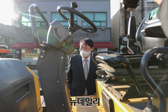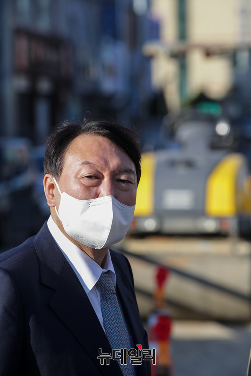 윤석열 국민의힘 대선 후보가 2일 오전 경기 안양시 안양동 안양여고 인근 도로포장 공사 사망사고 현장을 찾아 관계자에게 상황을 듣고 있다.