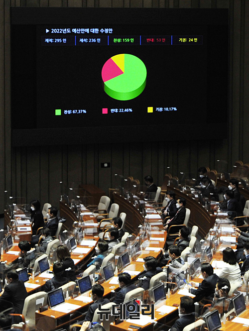 2022년도 예산안에 대한 수정안이 3일 오전 국회에서 열린 제391회국회(정기회) 13차 본회의에서 가결되고 있다. (사진=공동취재단)