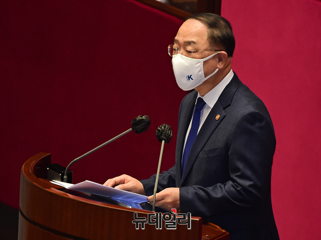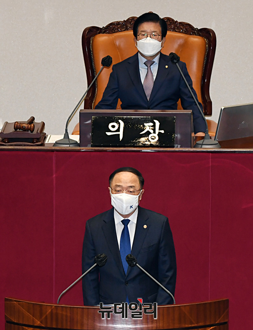 홍남기 경제부총리 겸 기획재정부 장관이 3일 국회에서 열린 본회의에서 2022년도 예산안 관련 제안설명을 하고 있다. (사진=공동취재단)