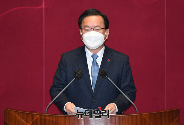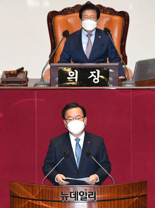 김부겸 국무총리가 3일 국회에서 열린 본회의에서 2022년도 예산안에 대한 수정안 통과 관련 정부측 인사말을 하고 있다. (사진=공동취재단)