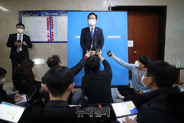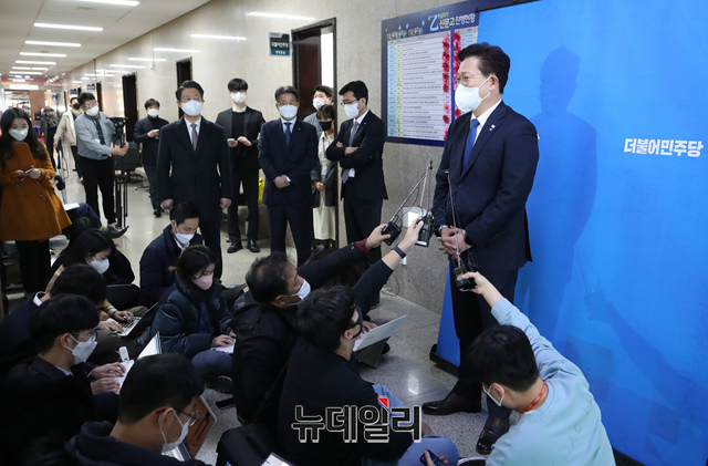 송영길 더불어민주당 대표가 3일 오전 국회 당대표실 앞에서 조동연 공동 상임선대위원장 관련 입장을 밝히고 있다. (사진=공동취재단)