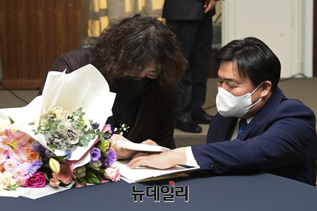 임병택 시흥시장과 김어준 씨가 3일 오후 서울 중구 한국프레스센터에서 열린 한국인터넷기자협회 창립19주년 기념식과 시상식에서 대화를 나누고 있다. 임 시장은 이날 시상식에서 지방자치행정상을 수상했다.