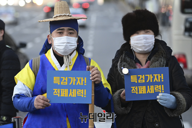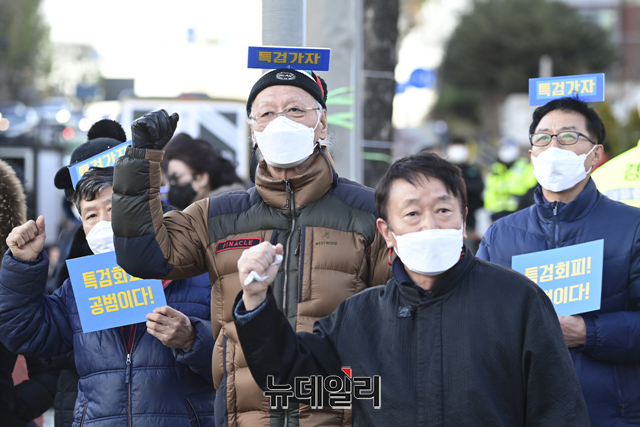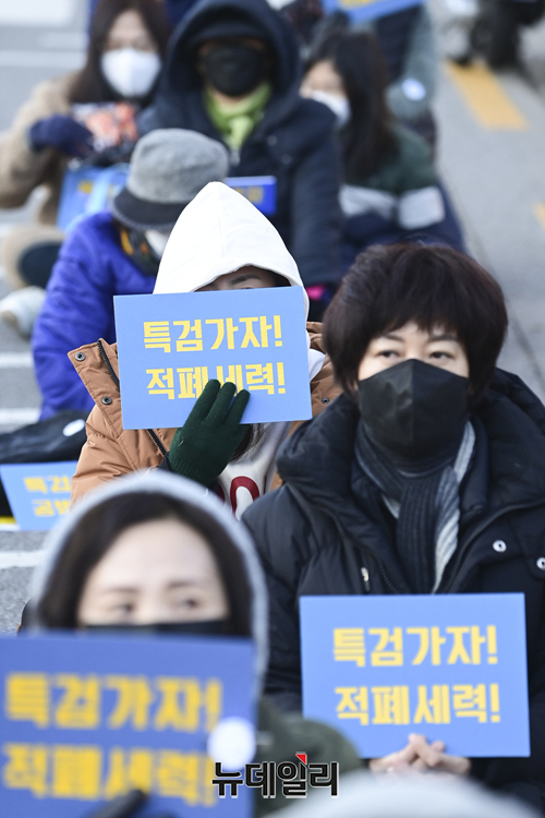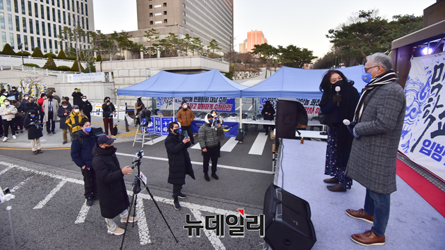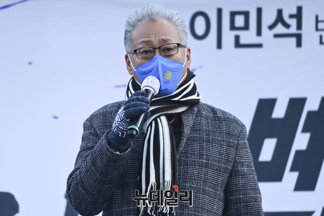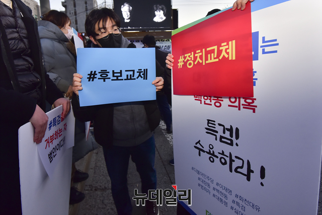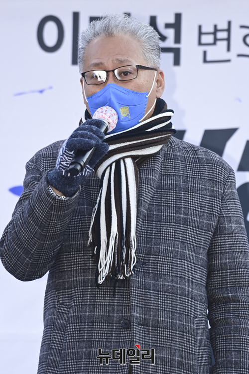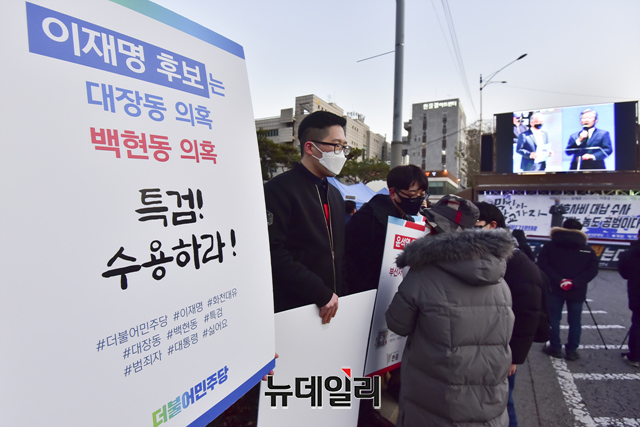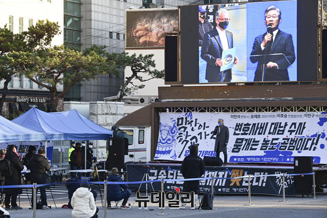 이민구 깨어있는시민연대당 대표가 4일 오후 서울 서초구 서울중앙지검 앞에서 열린 이재명 더불어민주당 대선 후보의 변호사비 대납과 대장동 화천대유 게이트를 규탄하는 집회에서 발언 하고 있다.깨시연은 "지난 8월 이 후보의 페이스북에서 지난해 대법원 무죄 판결을 받은 선거법 사건에 관련해 변호사비가 총 3억원이라고 주장을 했으나 특정 변호사 1인에게 현금과 주식을 포함해 20억여 원을 준 것으로 추정한다"고 말했다. 또 "검찰은 이 후보를 구속해 법의 엄중한 심판의 선례를 보여줘야 한다"고 했다.집회에는 이 대표, 이호승 전국철거민협의회중앙회 상임대표, 유재호 성남시의원, 이민석 변호사, 김석준 문사랑 카페 대표, 김부선 배우 등이 참석했다.