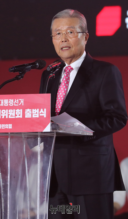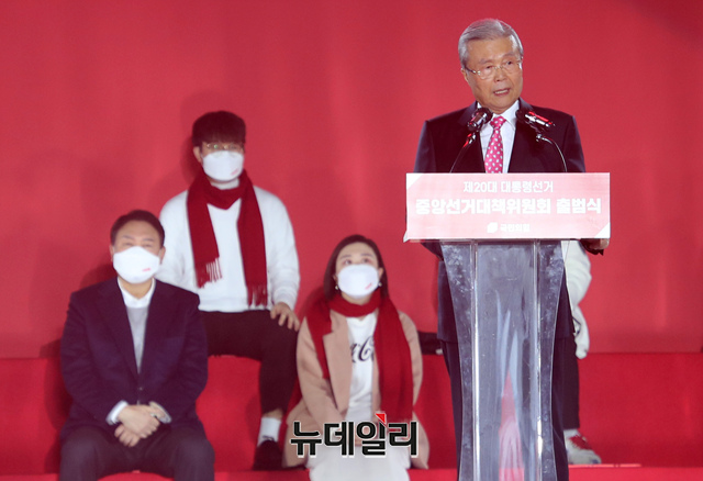 김종인 국민의힘 총괄선대위원장이 6일 서울 송파구 올림픽공원 체조경기장에서 열린 제20대 대통령선거 선거대책위원회 출범식에서 인사말을 하고 있다. (사진=공동취재단)