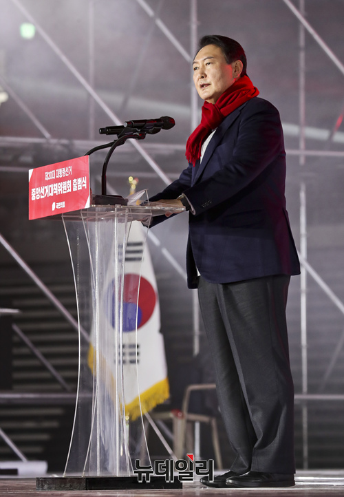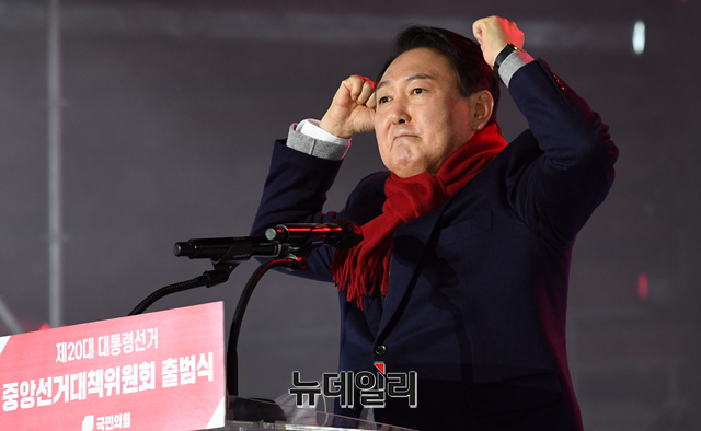 윤석열 국민의힘 대선 후보가 6일 서울 송파구 올림픽공원 체조경기장에서 열린 국민의힘 제20대 대통령선거 선거대책위원회 출범식에서 연설을 하고 있다. (사진=공동취재단)