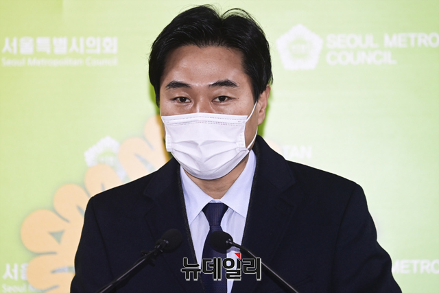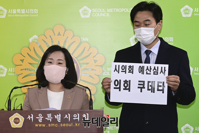 김소양 서울시의회 의원과 이종배 서울정상화시민협의체 상임대표가 8일 오전 서울 중구 서울시의회 기자회견실에서 서울시의회의 예산 독주를 규탄하는 기자회견을 갖고 있다.