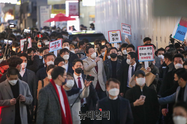 윤석열 국민의힘 대선후보가 8일 오후 서울 종로구 대학로에서 이준석 대표와 거리인사를 하고 있다. (사진=윤석열 캠프)